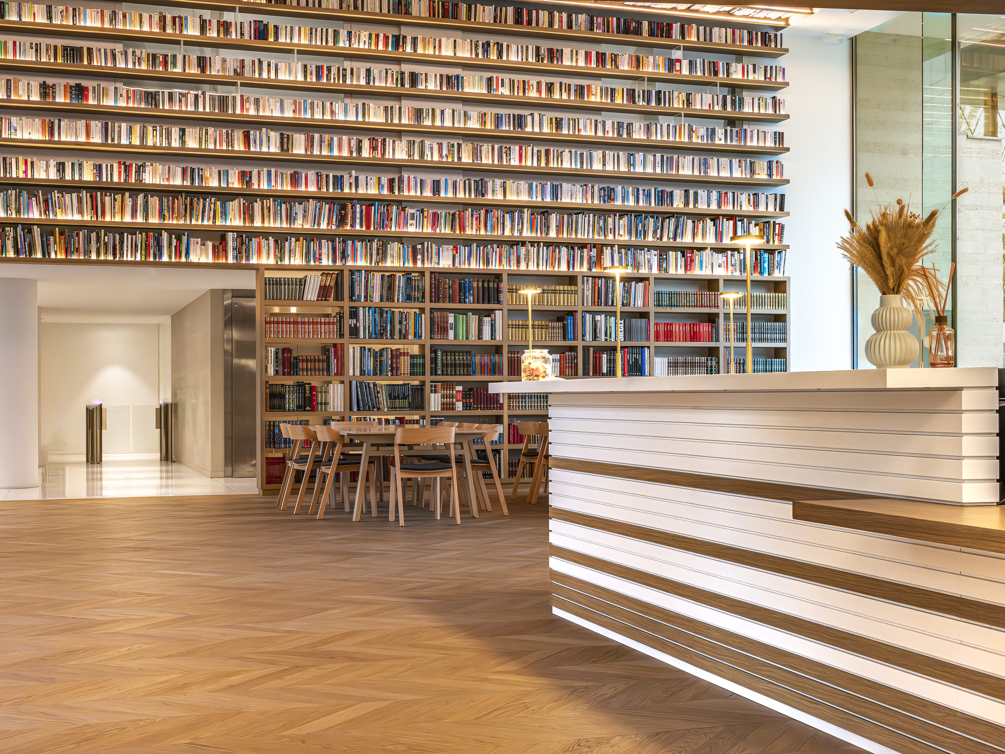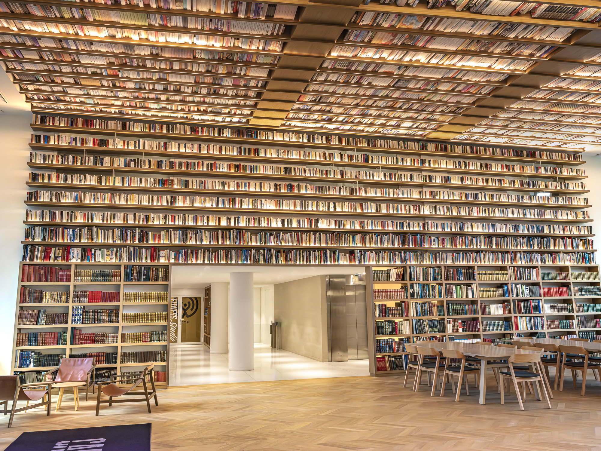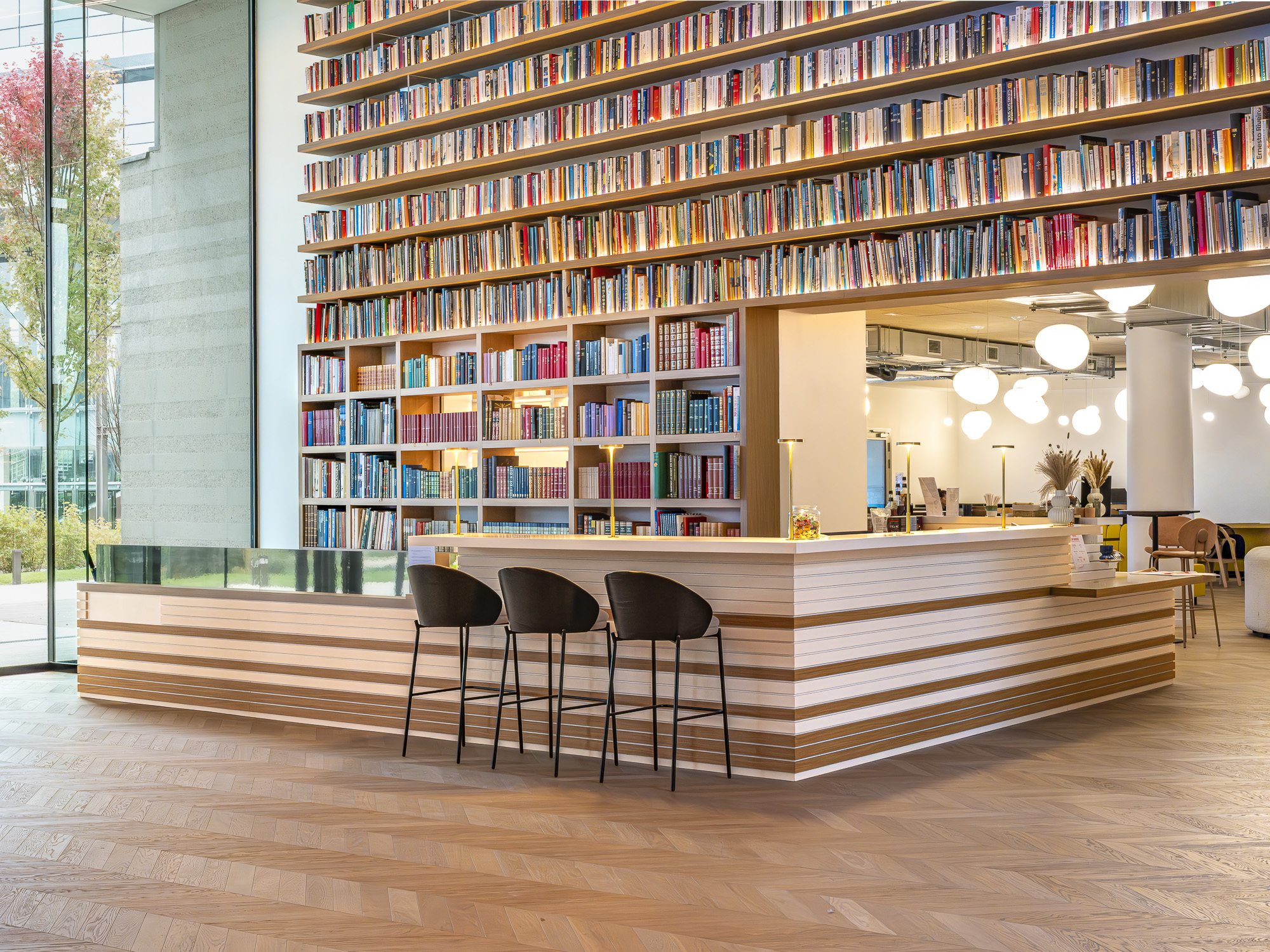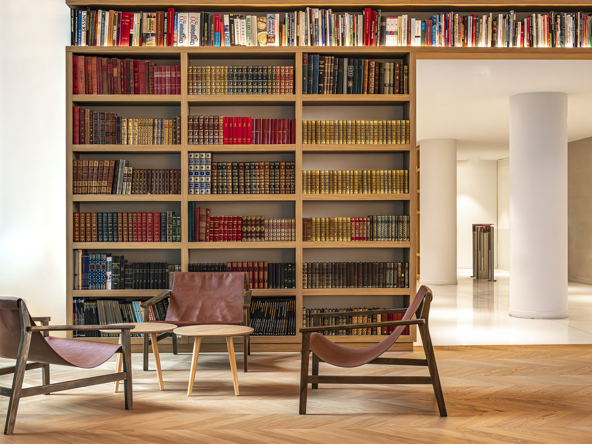 Dans le hall, installation d’une immense et spectaculaire bibliothèque. Agencement du restaurant.