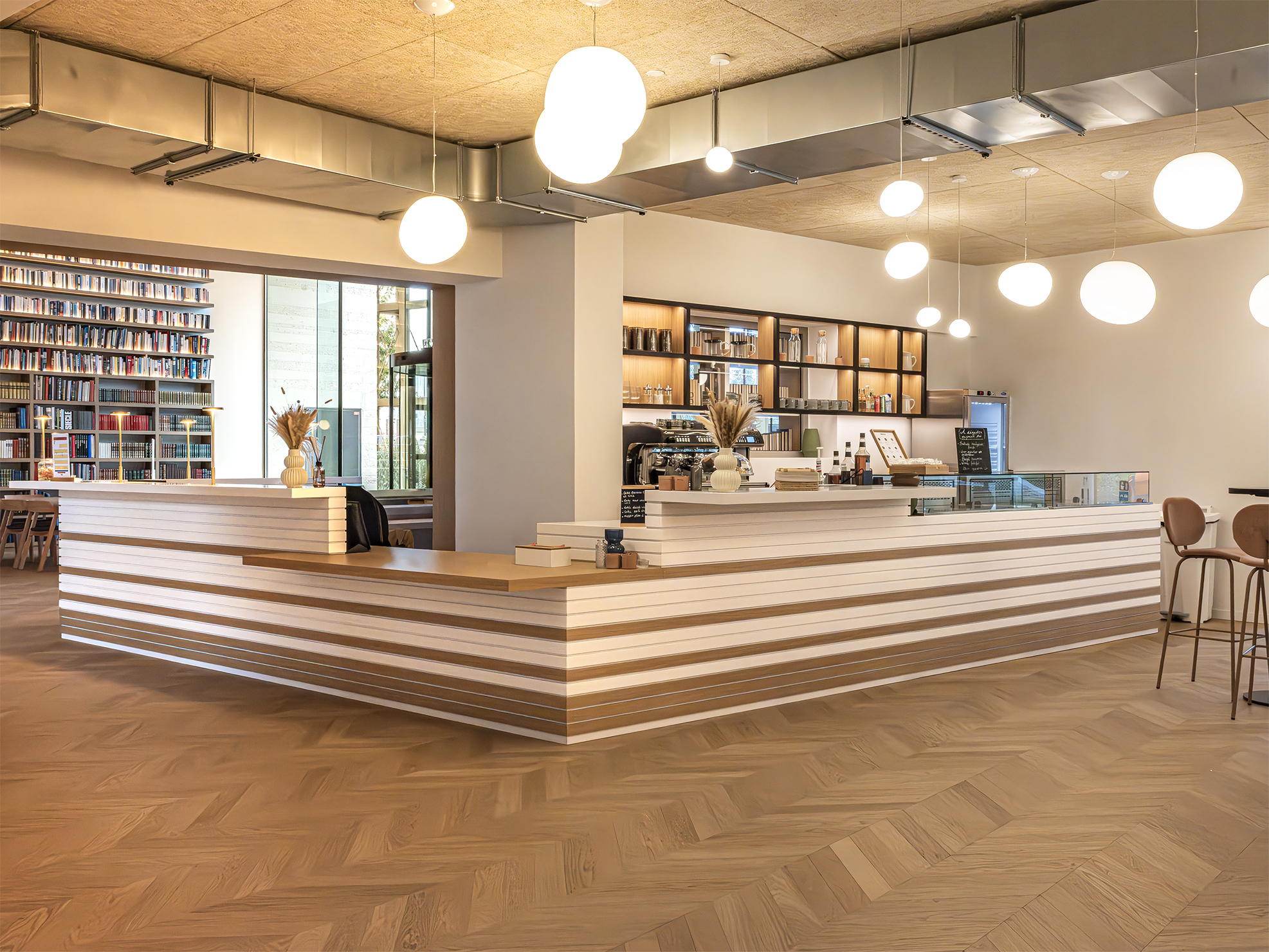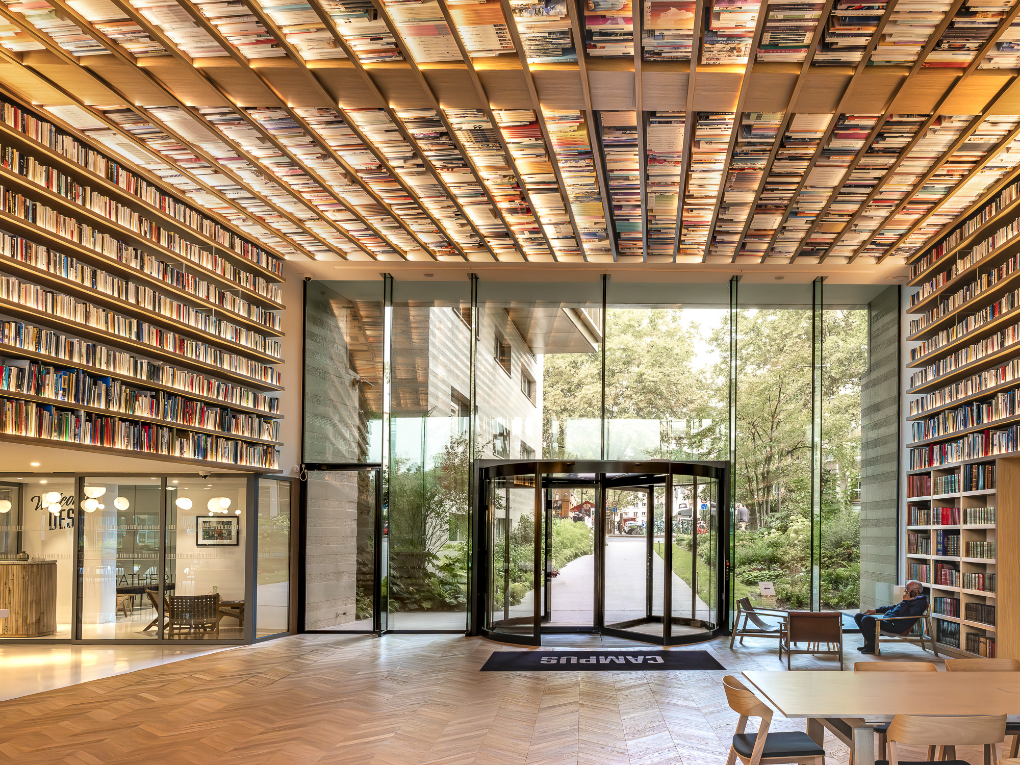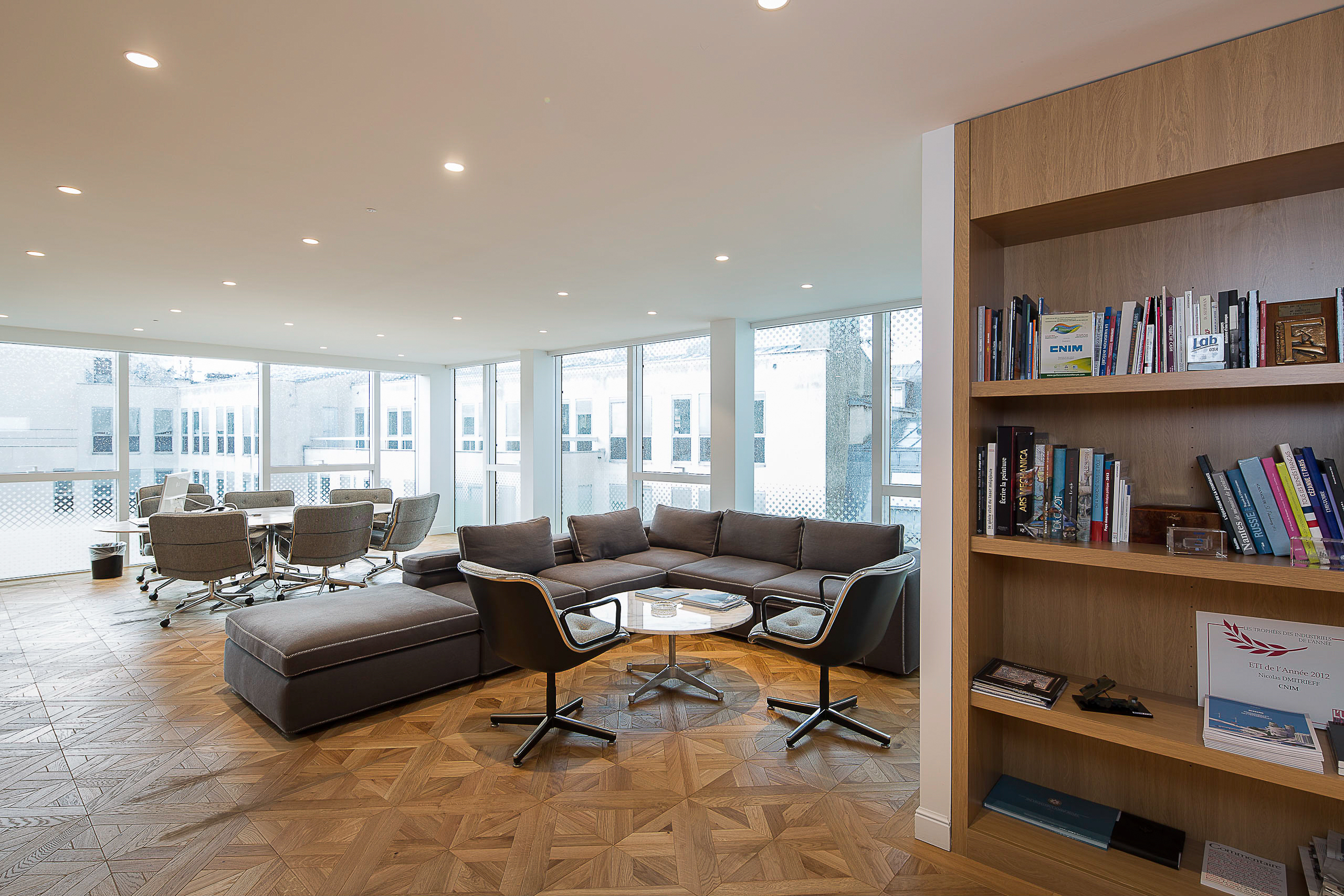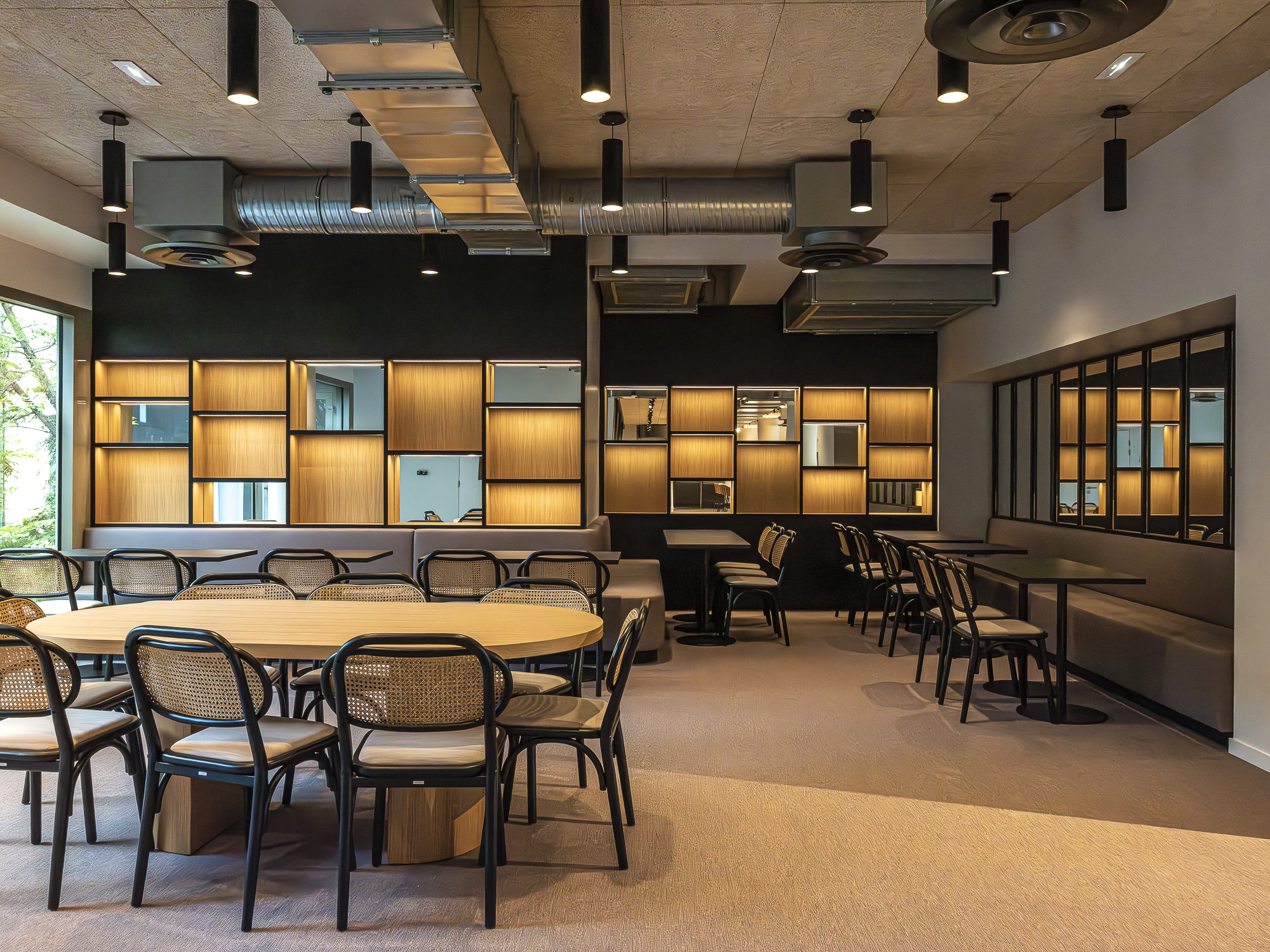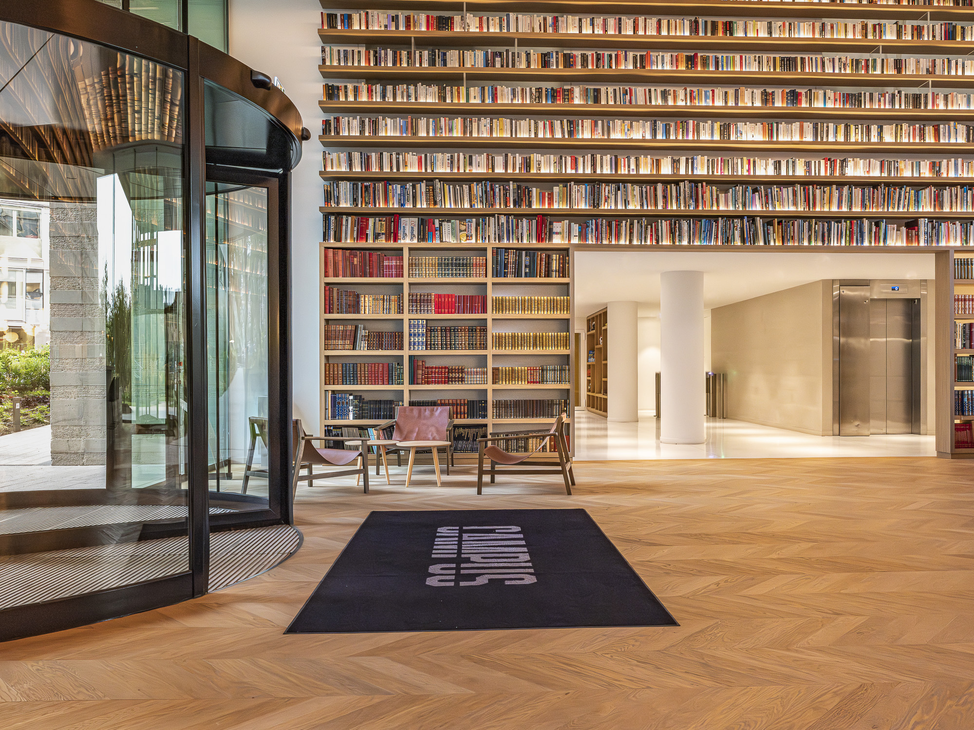 Dans le hall, installation d’une immense et spectaculaire bibliothèque. Agencement du restaurant.