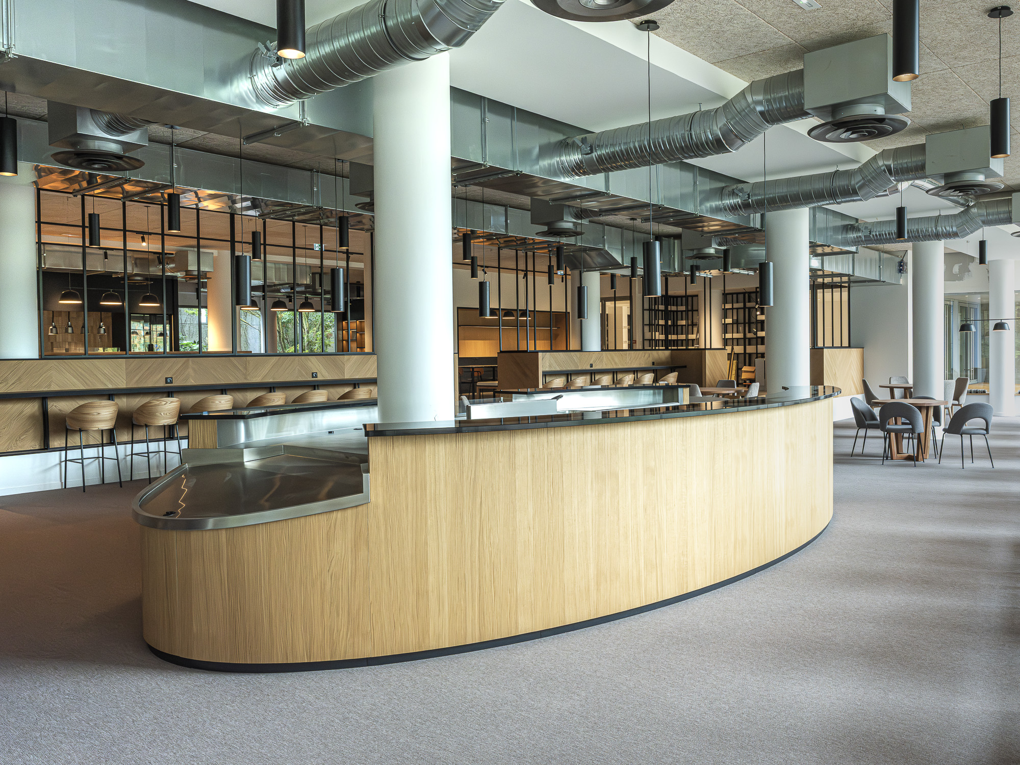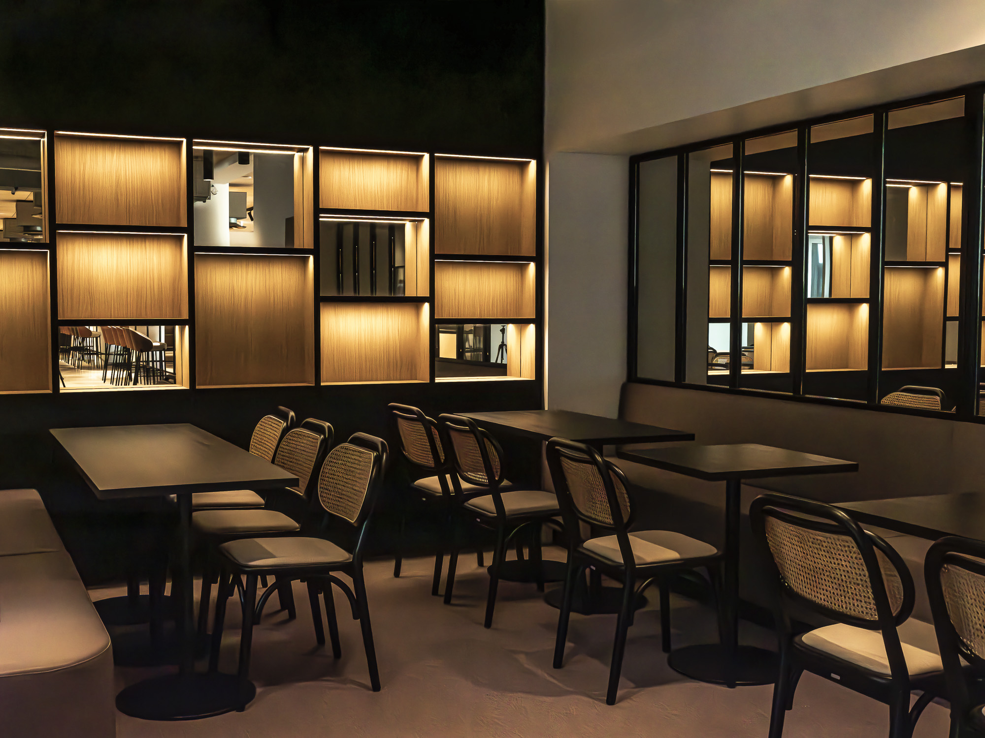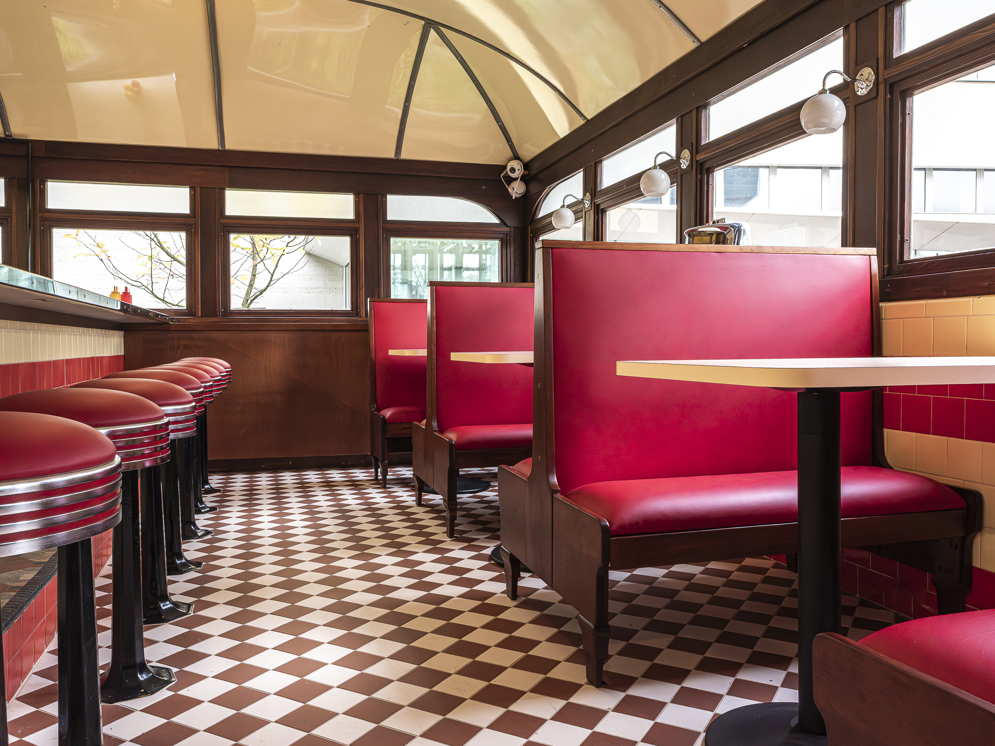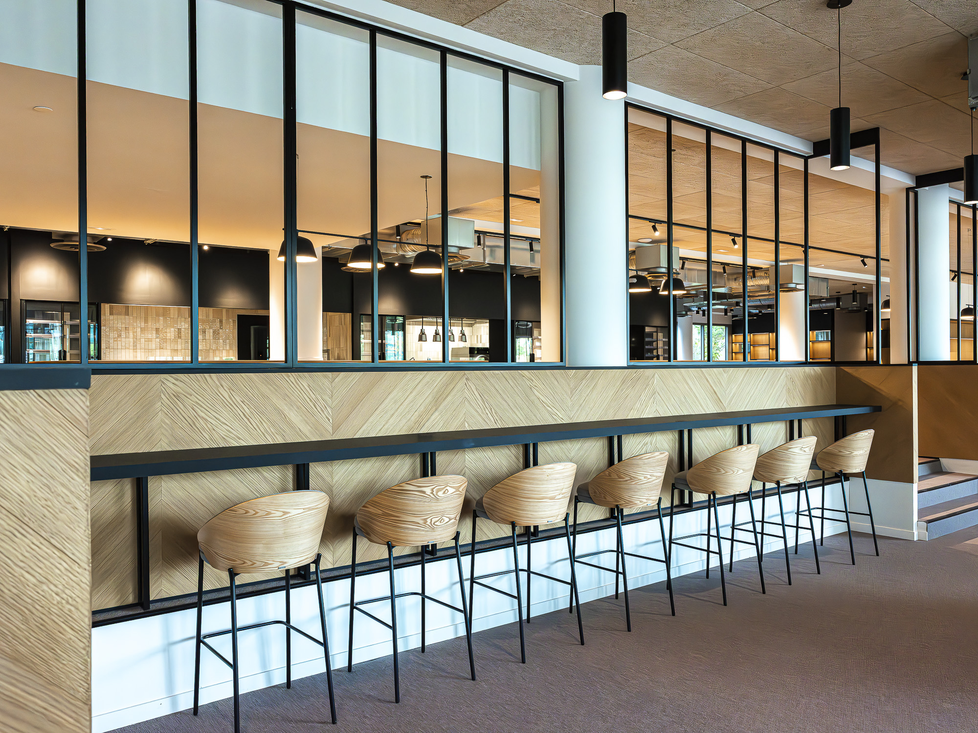 Dans le hall, installation d’une immense et spectaculaire bibliothèque. Agencement du restaurant.