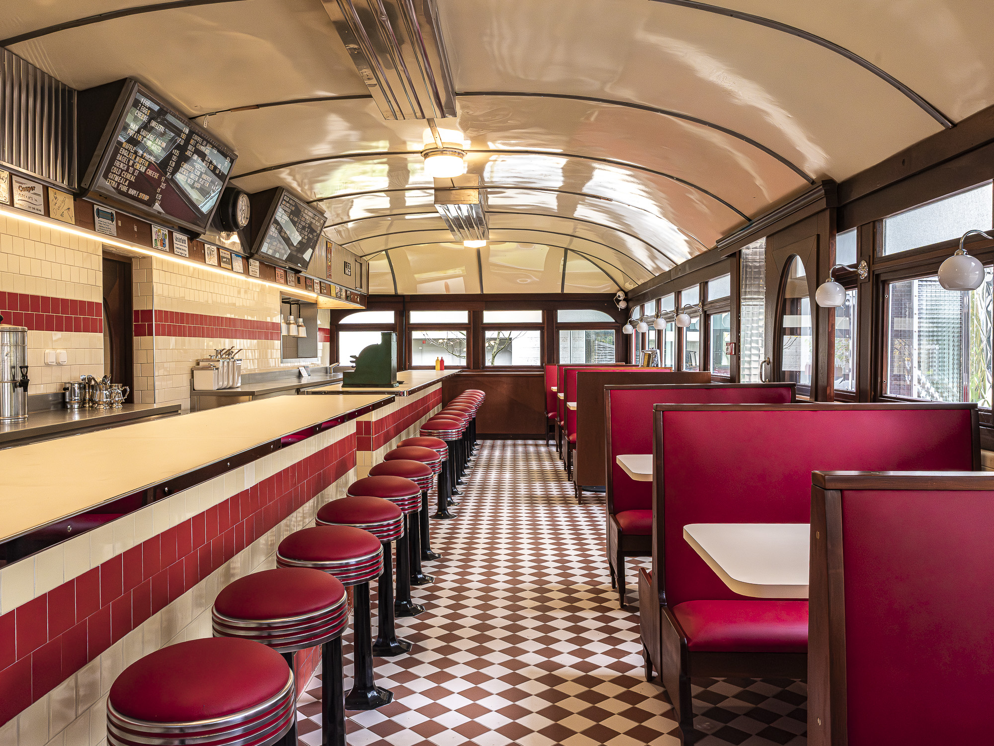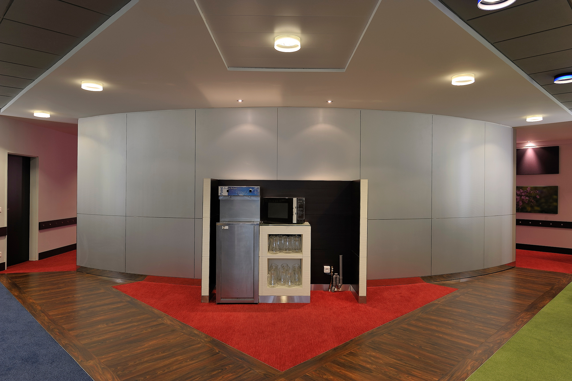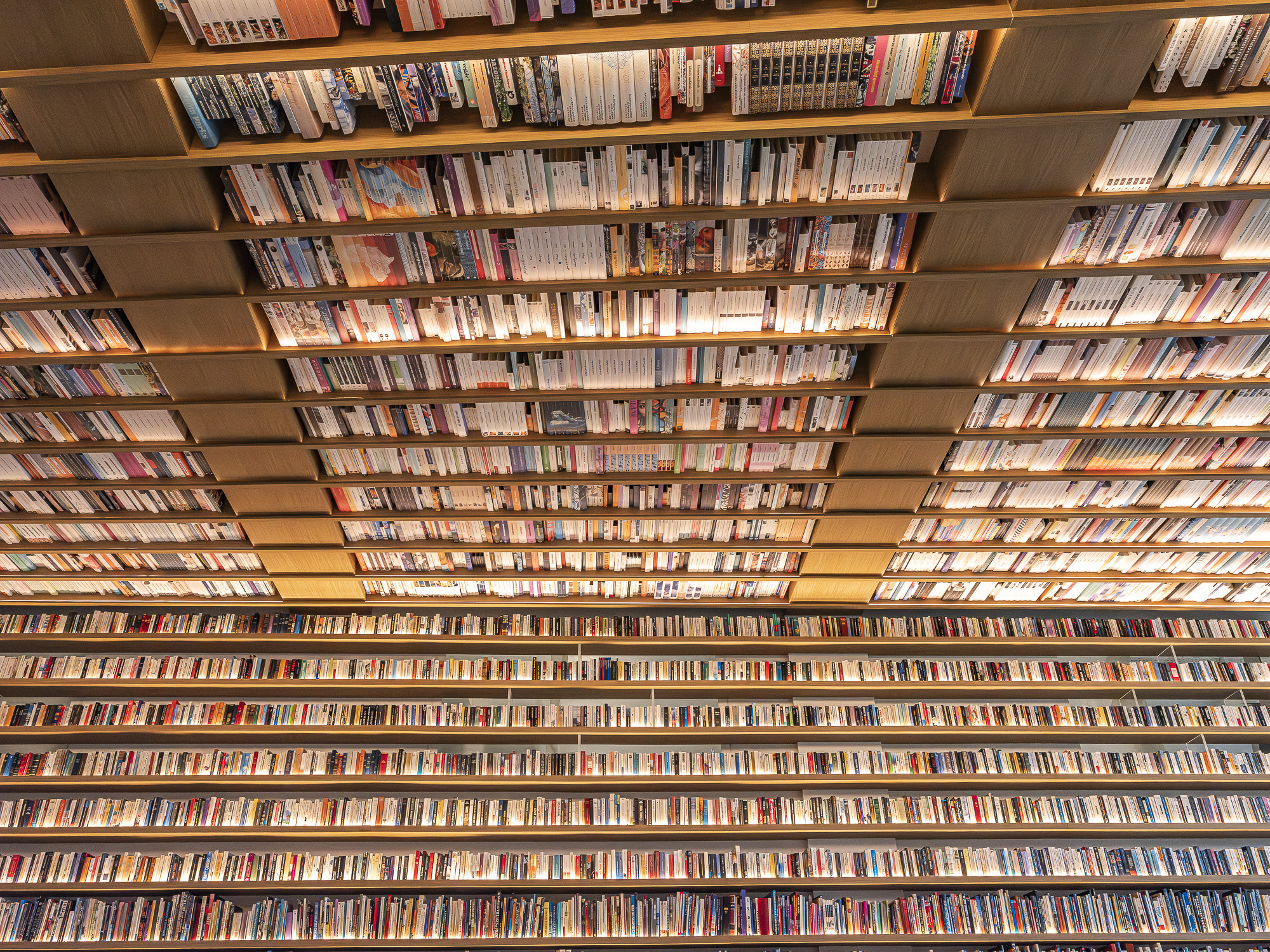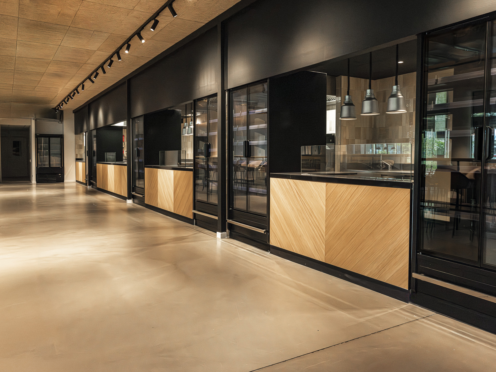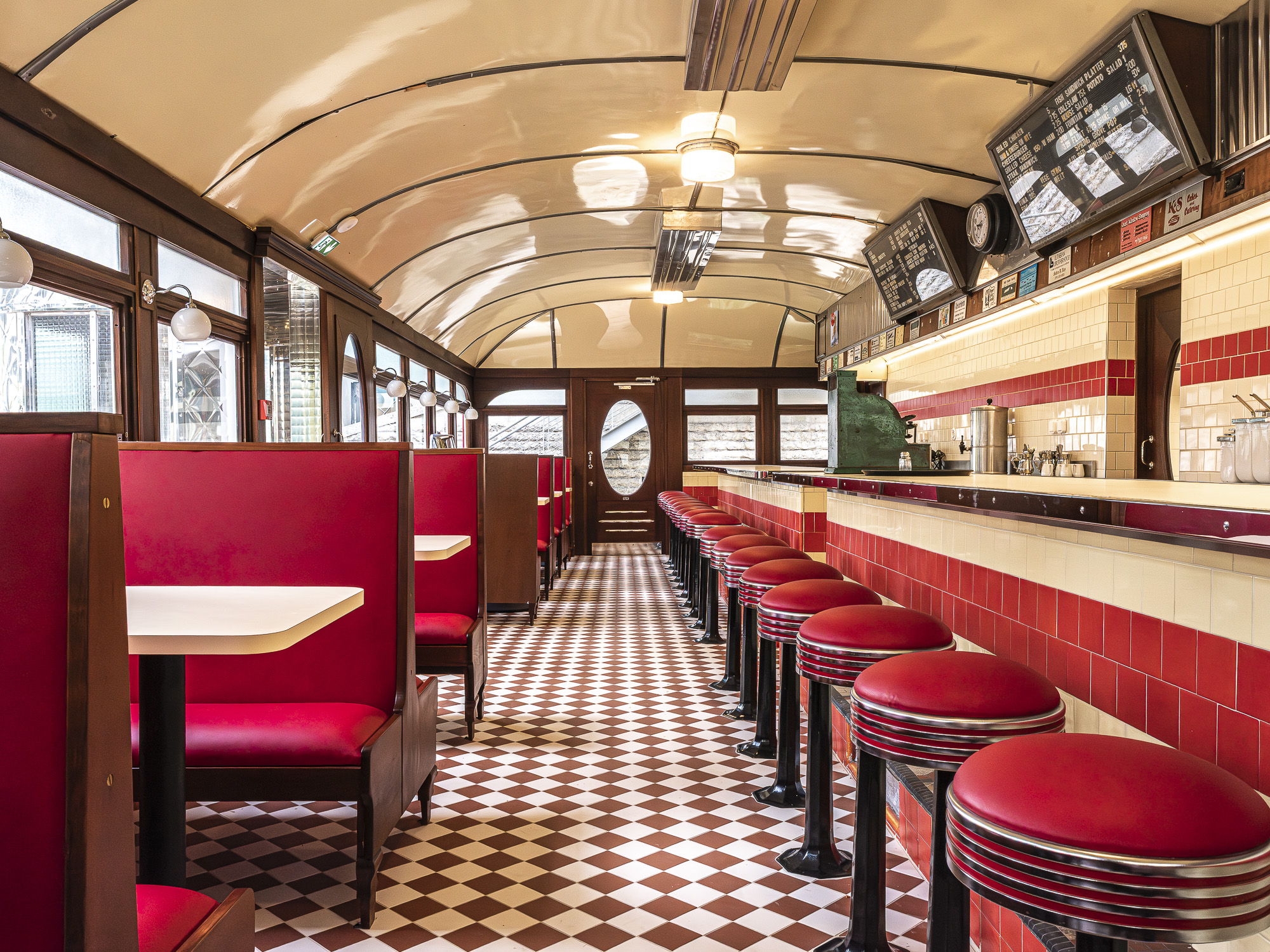 Dans le hall, installation d’une immense et spectaculaire bibliothèque. Agencement du restaurant.