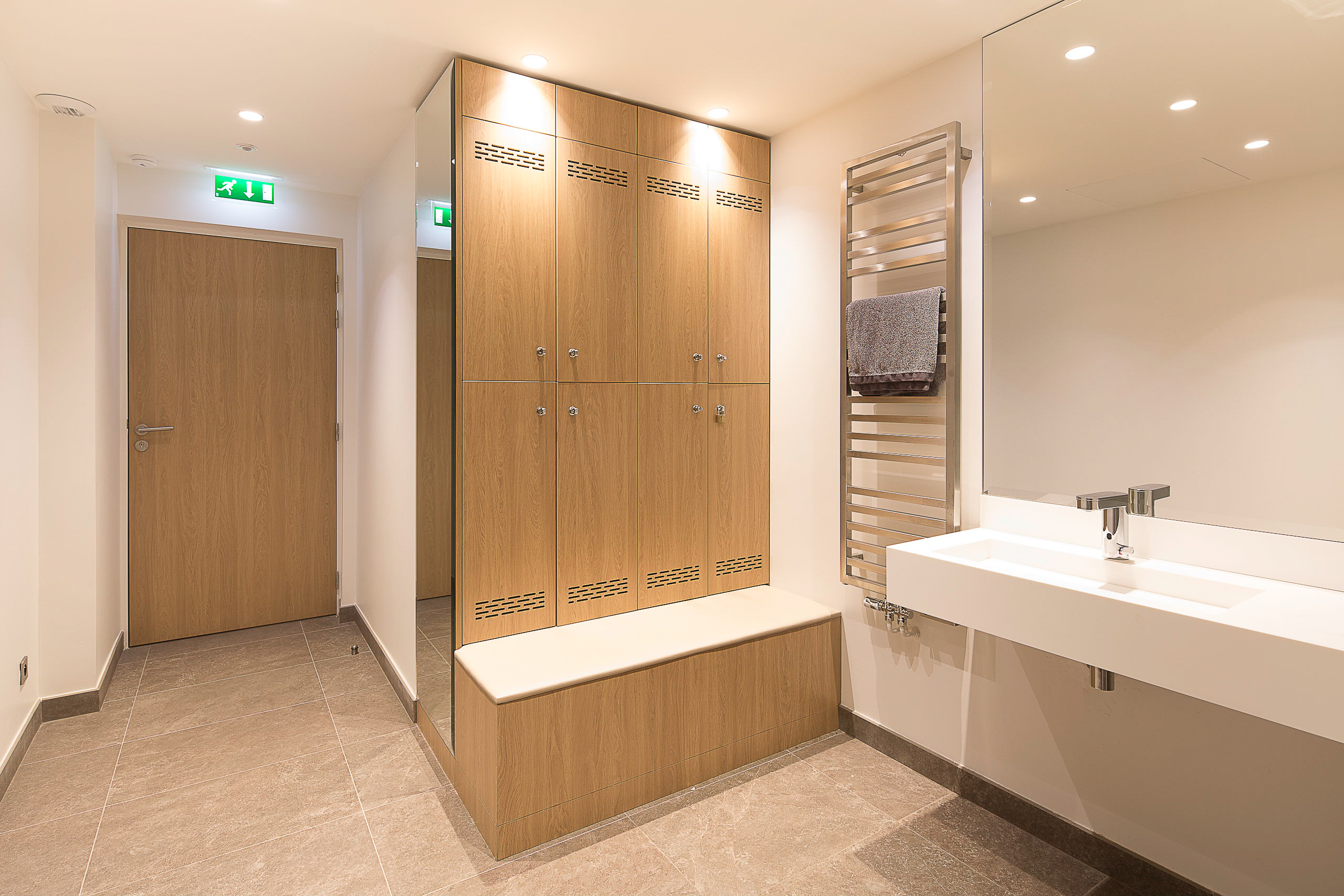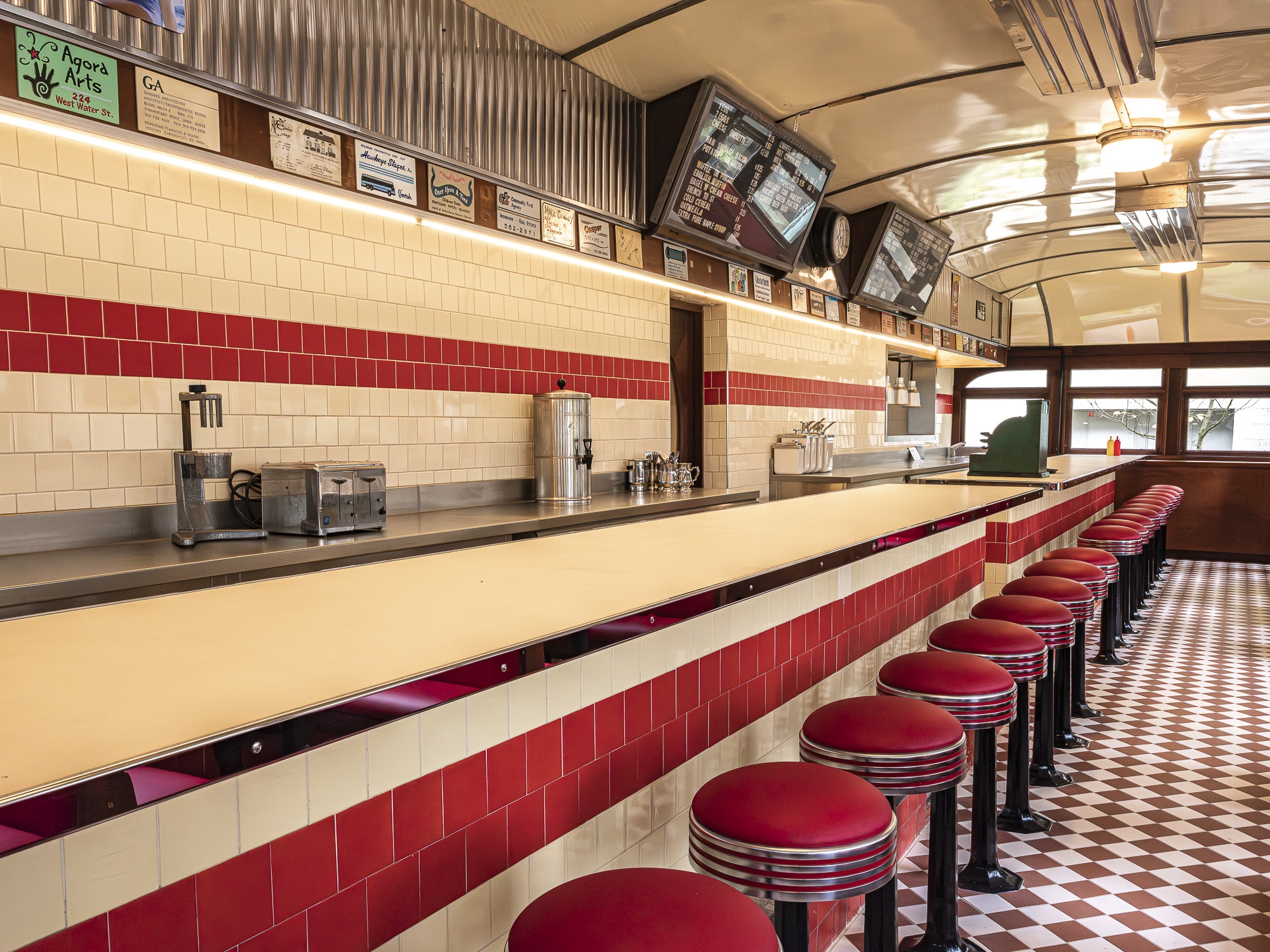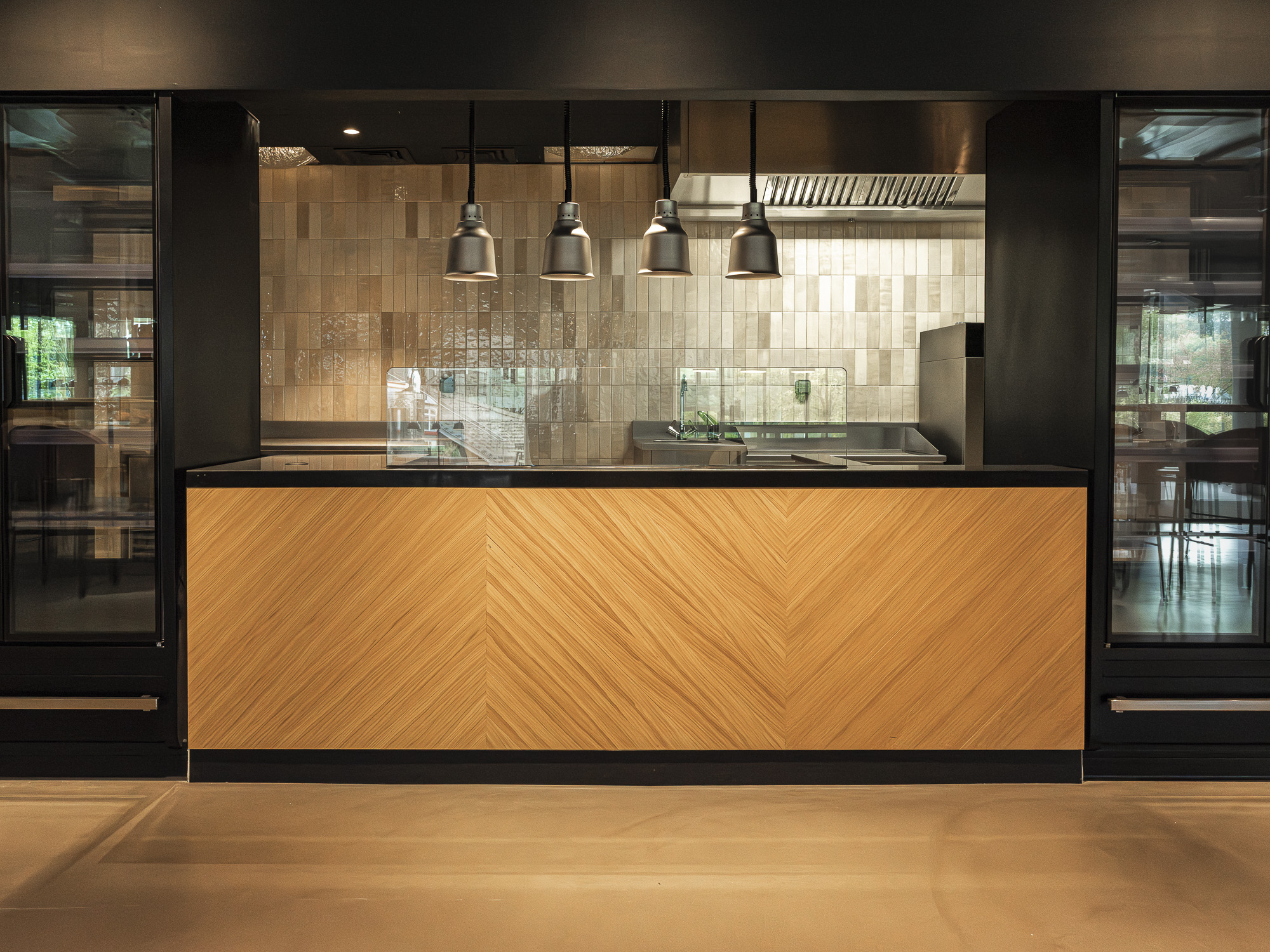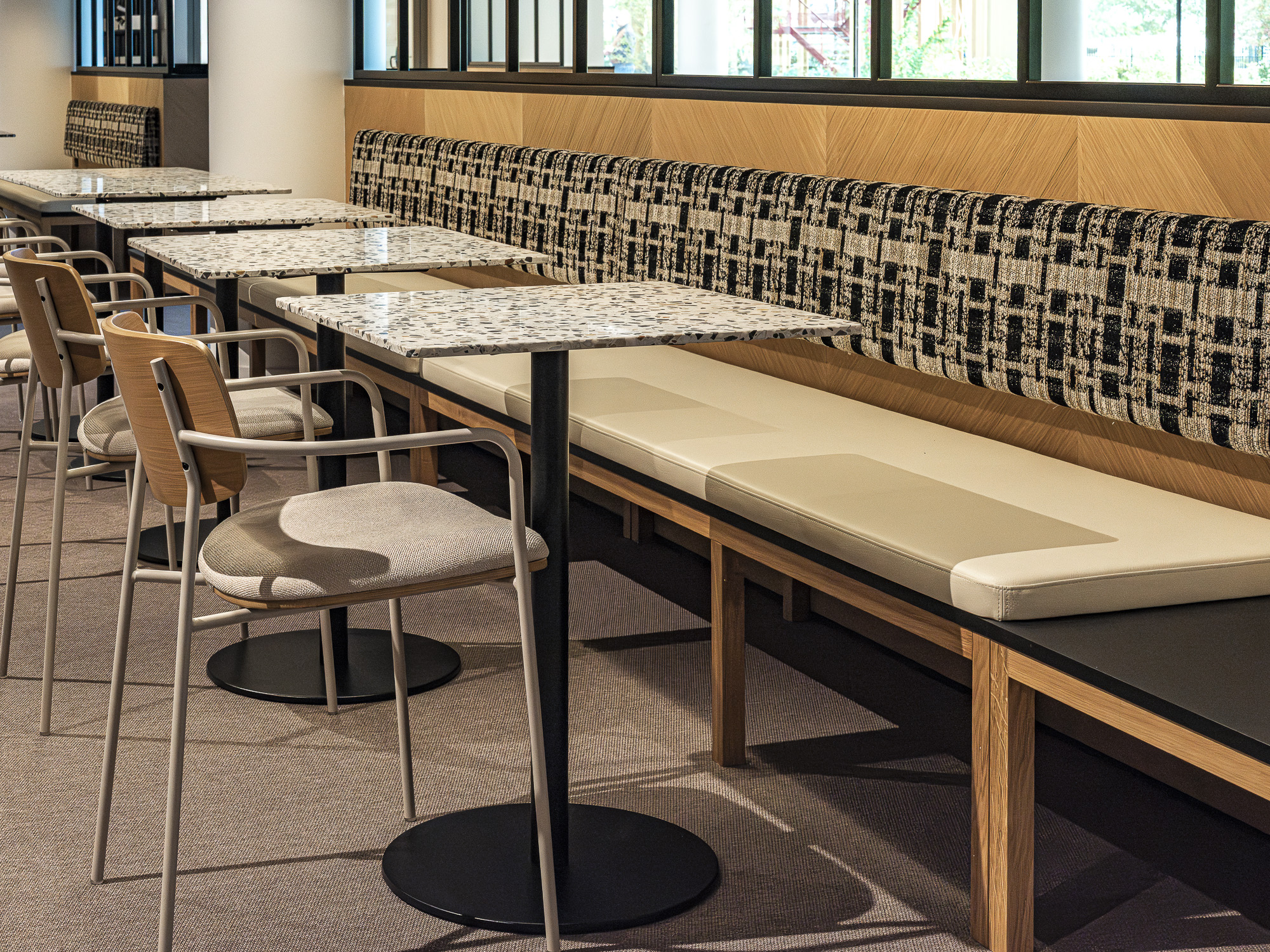 Dans le hall, installation d’une immense et spectaculaire bibliothèque. Agencement du restaurant.